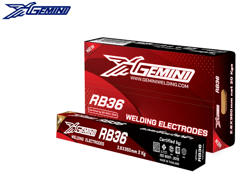 ลวดเชื่อมเจมินี่ GEMINI RB36 เป็นลวดเชื่อมไฟฟ้าเหล็กเหนียวคุณภาพสูงชนิดไททาเนียม (AWS A5.1 E6013) ลวดเชื่อมสำหรับเหล์กคาร์บอนปานกลางและคาร์บอนต่ำ