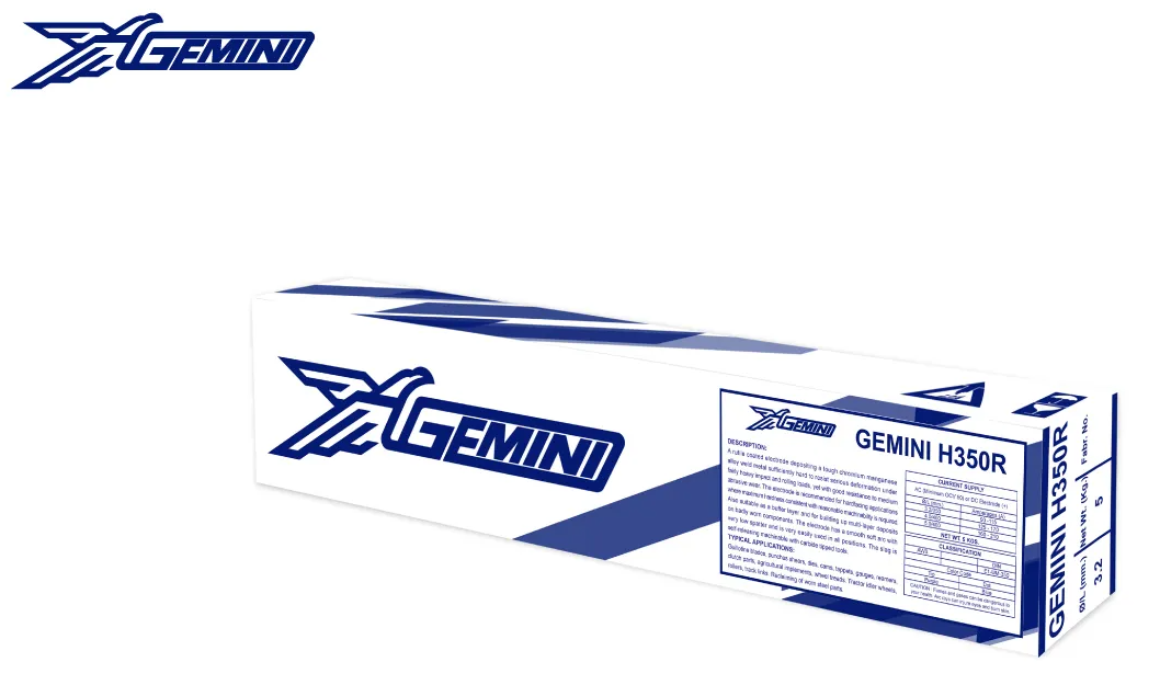GEMINI H350B DIN 8555/E 1-UM-350 เป็นลวดเชื่อมพอกผิวแข็งสารพอกหุ้มประเภทด่างไฮโดรเจนต่ำ เป็นลวดเชื่อมไฟฟ้าชนิดพอกผิวแข็ง ออกแบบมาเพื่อซ่อมบำรุงหรือเพิ่มความแข็งแรงให้ชิ้นส่วนโลหะที่ต้องรับแรงกระแทกและเสียดสีปานกลาง