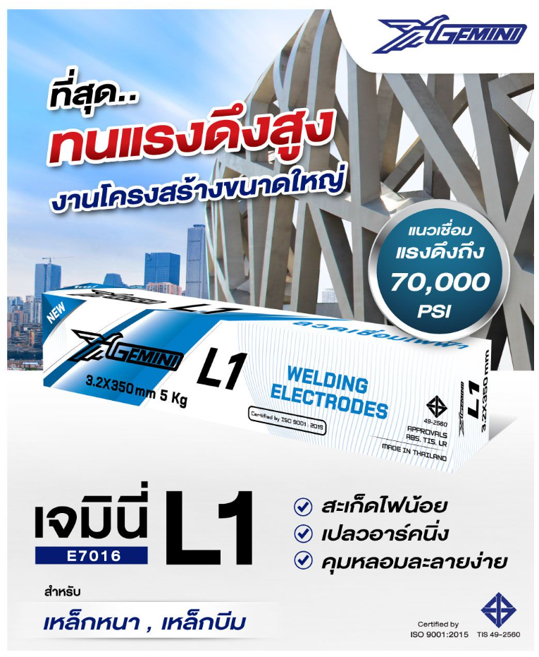 ลวดเชื่อม Gemini L-1 เป็นตัวเลือกที่เชื่อถือได้สำหรับงานเชื่อมเหล็กโครงสร้างที่ต้องการความแข็งแรงสูงและมีประสิทธิภาพในการใช้งานที่ดี ลวดเชื่อมคุณภาพที่ผลิตในประเทศไทยและได้รับการรับรองมาตรฐานสากล (เช่น Lloyd's Register / ABS)